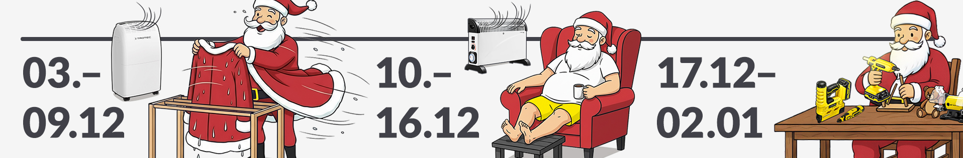 L'air est chargé d'anticipation, car chez TROTEC, la période de Noël annonce le moment le plus agréable de l'année. Pour des semaines de réjouissances festives qui se prolongeront jusqu'à la nouvelle année, nous plaçons sous le sapin de Noël les meilleurs accessoires pour votre maison. En effet, le Père Noël apprécie non seulement les biscuits, mais également la technologie fonctionnelle de TROTEC.